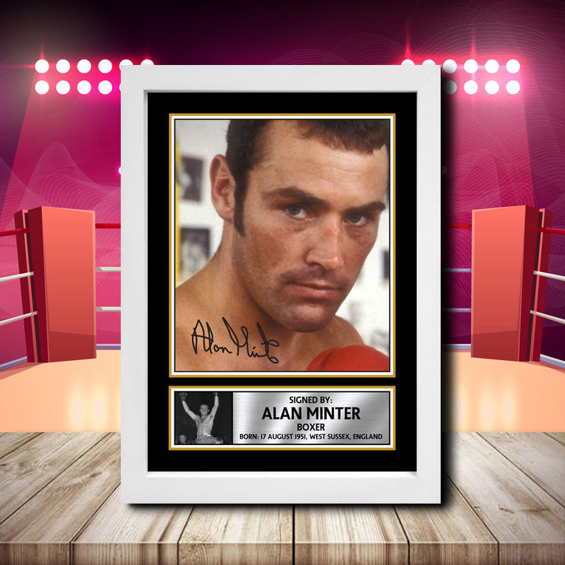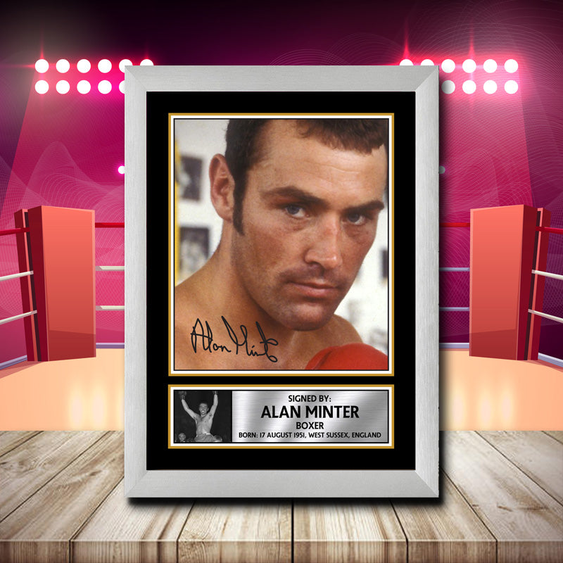 SEO Meta Description: Uncover the experience, expertise, authority, and trust of the Alan Minter 2 - Signed Autographed Merch Boxing Star Print - a must-have for boxing fans. Celebrate the legacy of a boxing legend with this authentic collectible.