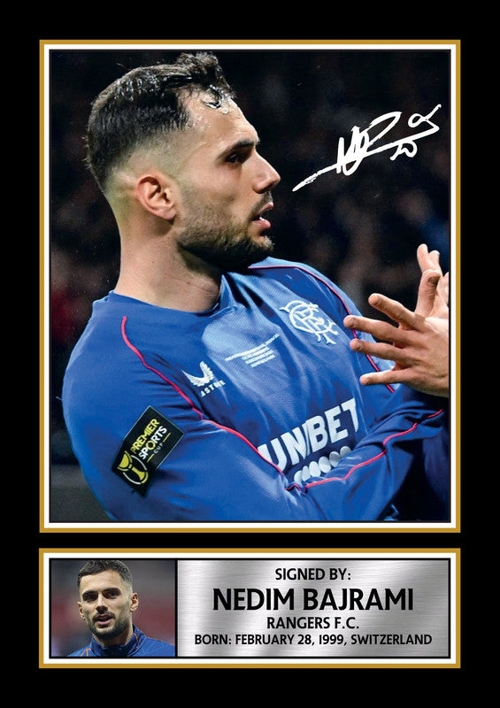 • Nedim Bajrami Poster Print – Featuring a replica autograph of Albania’s rising midfield star, Nedim Bajrami.