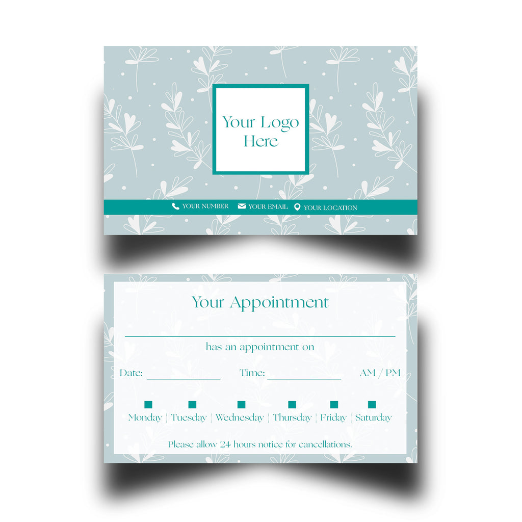 Personalise this design with your own information before checkout and we will edit the design to suit your requirements. All our appointment cards are printed on 350gsm silk card and finished to 85mm x 55mm in size. Select the desired amount of cards and let us do the rest.