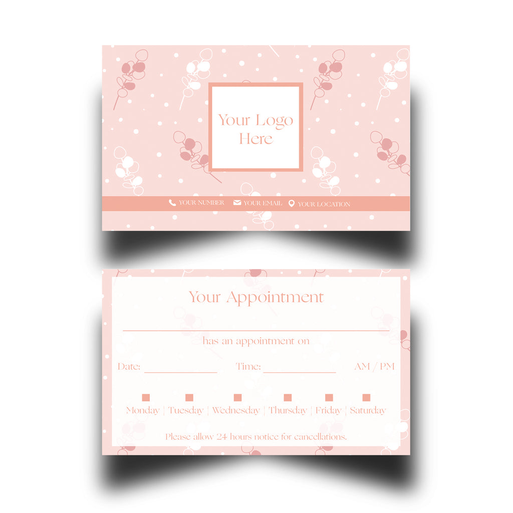 Personalise this design with your own information before checkout and we will edit the design to suit your requirements. All our appointment cards are printed on 350gsm silk card and finished to 85mm x 55mm in size. Select the desired amount of cards and let us do the rest.