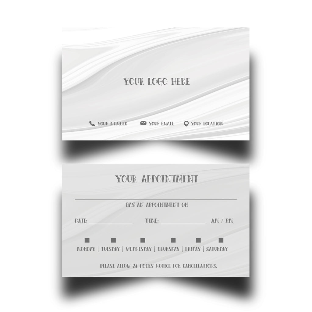 Personalise this design with your own information before checkout and we will edit the design to suit your requirements. All our appointment cards are printed on 350gsm silk card and finished to 85mm x 55mm in size. Select the desired amount of cards and let us do the rest.