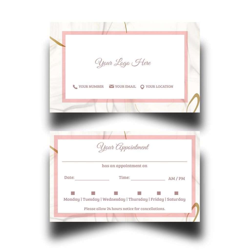 Personalise this design with your own information before checkout and we will edit the design to suit your requirements. All our appointment cards are printed on 350gsm silk card and finished to 85mm x 55mm in size. Select the desired amount of cards and let us do the rest.