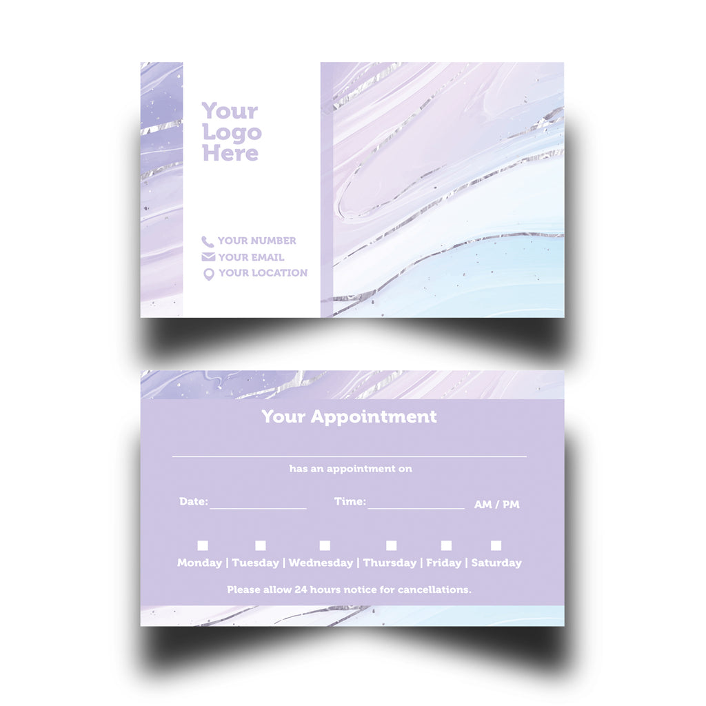 Personalise this design with your own information before checkout and we will edit the design to suit your requirements. All our appointment cards are printed on 350gsm silk card and finished to 85mm x 55mm in size. Select the desired amount of cards and let us do the rest.